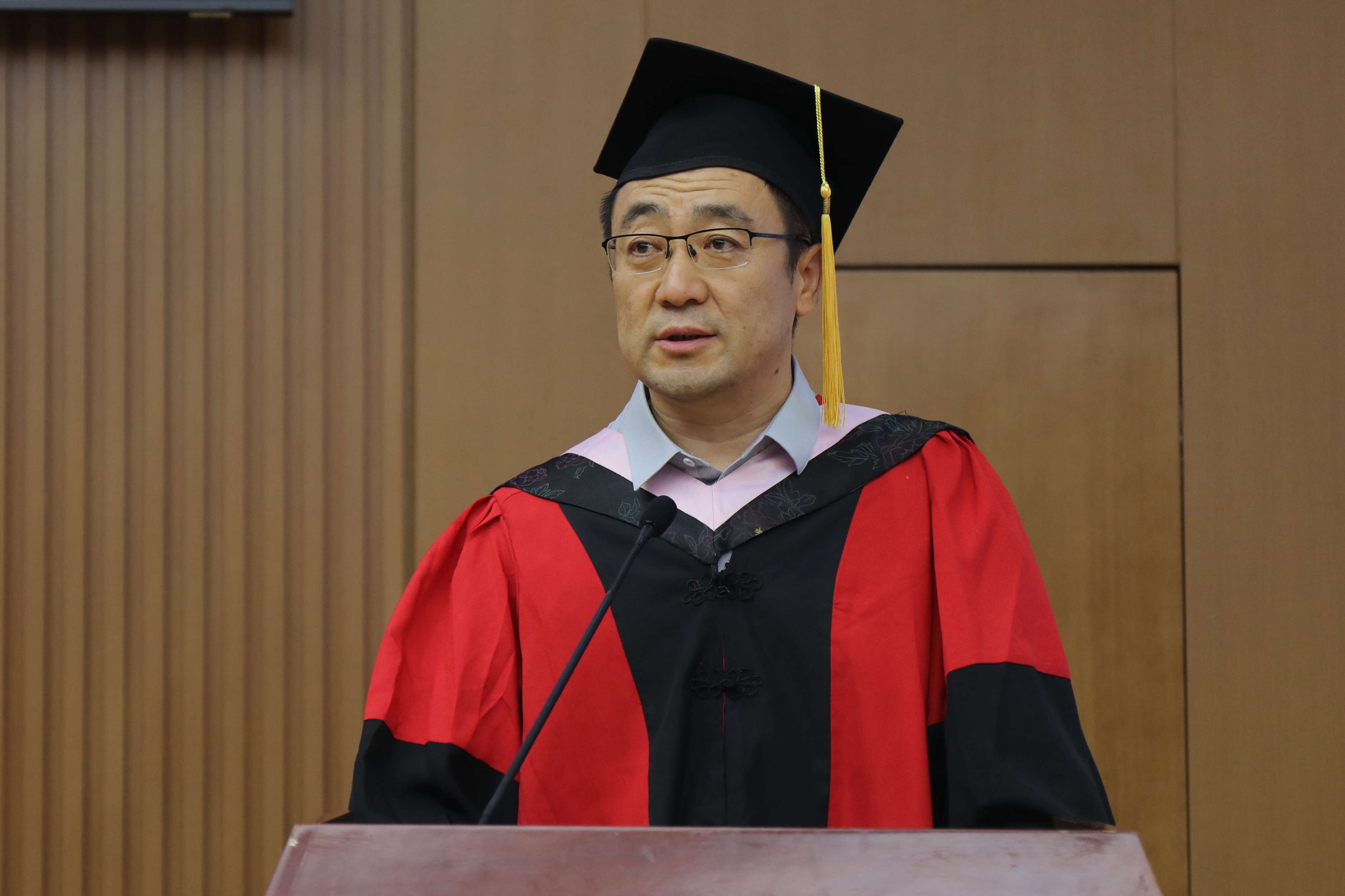 在热烈的掌声中,麻宝斌教授发表讲话。他首先代表蜜桃视频 向顺利完成学业的同学们表示热烈祝贺,向悉心培育、关心支持同学们的导师和所有付出辛劳的教师表示衷心感谢。他指出,对于成功人们并没有一致的看法,仁者见仁,智者见智。同时,从“何为成功”和“如何成功”,将成功分为三重境界,分享了几点思考和对同学们的期待。第一重境界是个人意义上的成功,成功首先要具有稳定的价值观、强大的内核,也就是“心力”,即一个人的心理能量和精神力量。第二重境界是社会意义上的成功,要具有清晰的人生观——重新确立人与人之间的关系,社会成功不能靠个人单打独斗,而是要靠团队合作去造福社会。第三重境界是精神意义上的成功,要精神觉醒,真正认识到自己与世界的关系,明确自己的人生使命。最后他对同学们提出三点嘱托:一是要为自己书写自己的人生剧本,而不是按照别人的剧本生活;二是当面临人生关键选择时,要把“向下扎根,向上开花”作为人生方向,要把“向内成长,向外奉献”作为人生主线,要把“守住底线,不设上限”作为人生信条。三是要遵从内心的召唤,勇敢地去做真正热爱且擅长的事,长风破浪会有时,直挂云帆济沧海!
