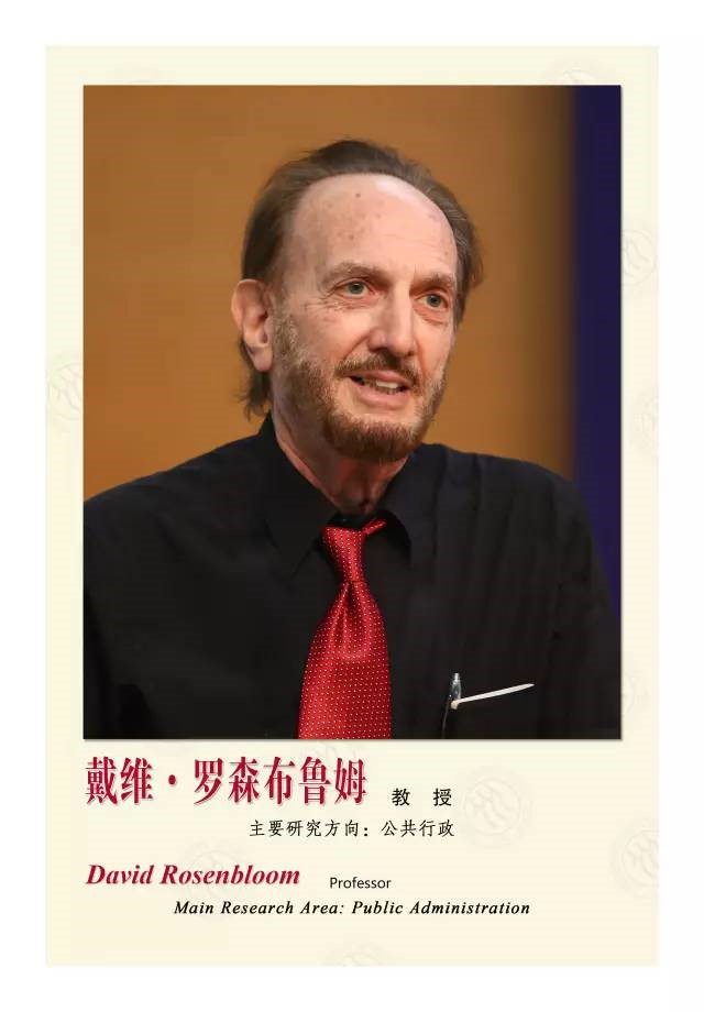 戴维·罗森布鲁姆教授在芝加哥大学获得政治学博士,现为美国美利坚大学杰出教授和中国人民大学外专千人计划专家,美国行政科学院院士,曾经担任顶级SSCI期刊Public Administration Review (1991-1996)和Policy Studies Journal (1985-1990)的主编。