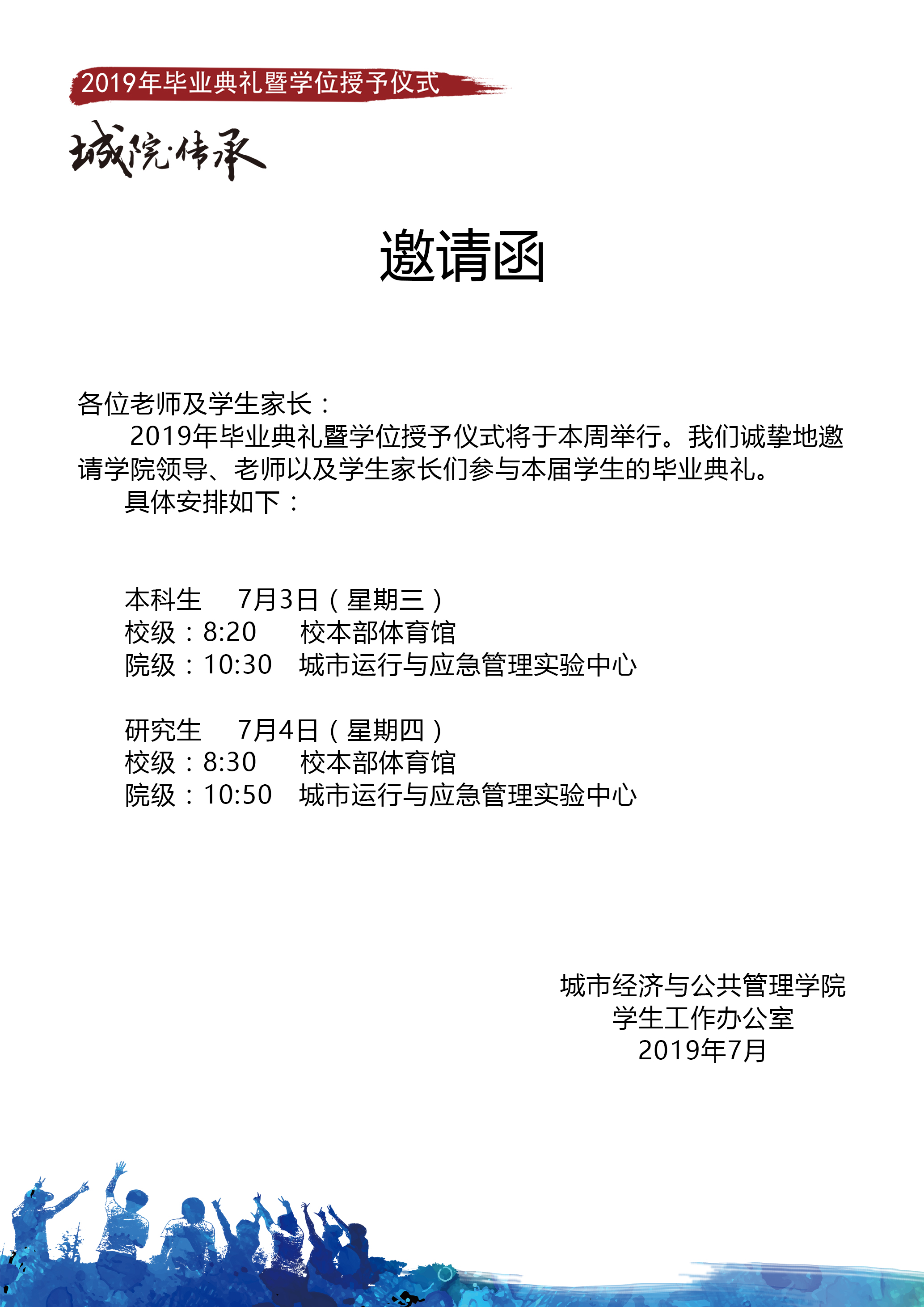 2019年学生毕业典礼暨学位授予仪式将于本周举行。我们诚挚地邀请学院领导、老师以及学生家长们参与本届学生的毕业典礼。