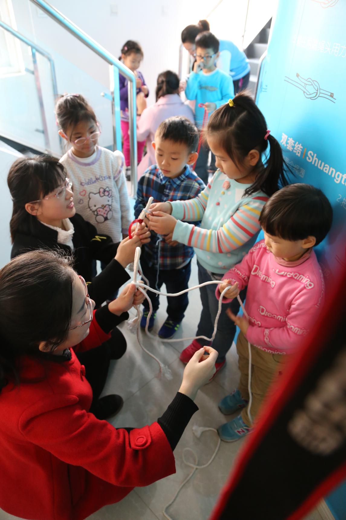 党支部成员们耐心的为小朋友们讲解户外打结绳法。