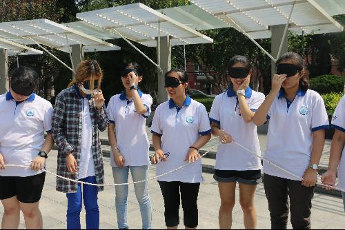 随后,考验团队沟通力、领导力,解决问题能力的拓展项目“盲人方阵”活动开始了。要求各组同学在戴着遮光眼罩的情况下,将一根长绳围成一个尽可能大的正方形,并且所有队员要均匀分布在各边,用时短者获胜。经过短暂的混乱和磨合,各组很快找到了各自的解题之法,有的团队一边尝试一边集众人之力讨论优化方法,有的团队在组长的带领下商讨好方案后再行动,所有队员听从队长指挥。每种策略都有各自的优缺点,每名班级成员在这个游戏中不仅锻炼了敏捷的思维方式,也增加了彼此的默契,各班的团队凝聚力和协调力有了明显的提升。这个项目架起了沟通的桥梁,还教会同学们在某些时候,服从的重要性。