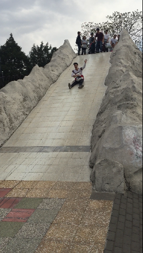 活动开始后,师生们积极挑战踢毽子活动,经过数轮的传、踢与配合,两组几乎同时完成任务,在欢声笑语中分头执行活动任务。第一组组长何顺红同学,带领李坚圣,廖建成,徐扬,李东阳,符人伟等同学朝西方向出发。第二组组长刘畅同学,带领任怡,朱蓉剑,李双庆,付柏乔,刘骞等同学朝东方向出发。在五十分钟后,两组队员在任务四“童心未泯”的大雪山石板滑梯处汇合,同学们勇敢挑战了大雪山的滑行,李东阳同学趣谈小时候对大雪山望而生畏,今天战胜了童年恐惧,完成了自我挑战。