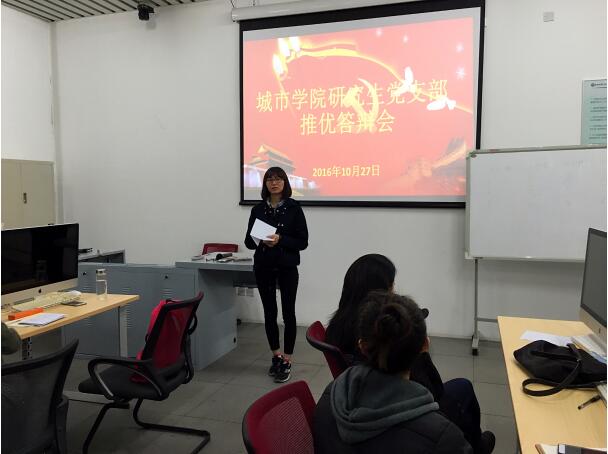 2016年10月27日晚,蜜桃视频 研究生党支部在城市应急实验室114室进行了城市学院研究生党支部入党积极分子推优答辩会。会议的主要内容是讨论并决议5位入党积极分子推优问题。研究生党支部全体党员、入党积极分子以及8名群众参加本次会议。会议由研究生党支部副书记武帆主持。