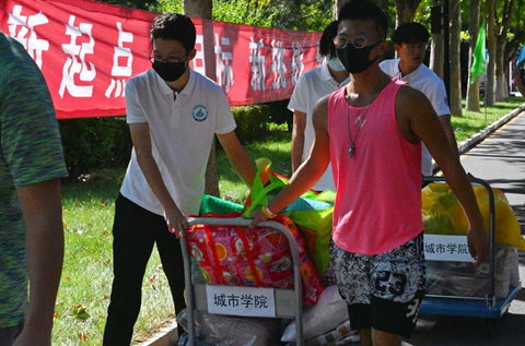 由于处于疫情防控阶段,不允许家长送学生入校,学院分团委、学生会、研究生会组织了一支50余人的迎新志愿服务团队,帮助新生和家长搬运行李。清晨,6:30,各个志愿者便已到岗,搬运迎新物资,在学校门口迎接新生,帮助新生一起搬运行李、做向导,以保证所有新生顺利报到入学。
