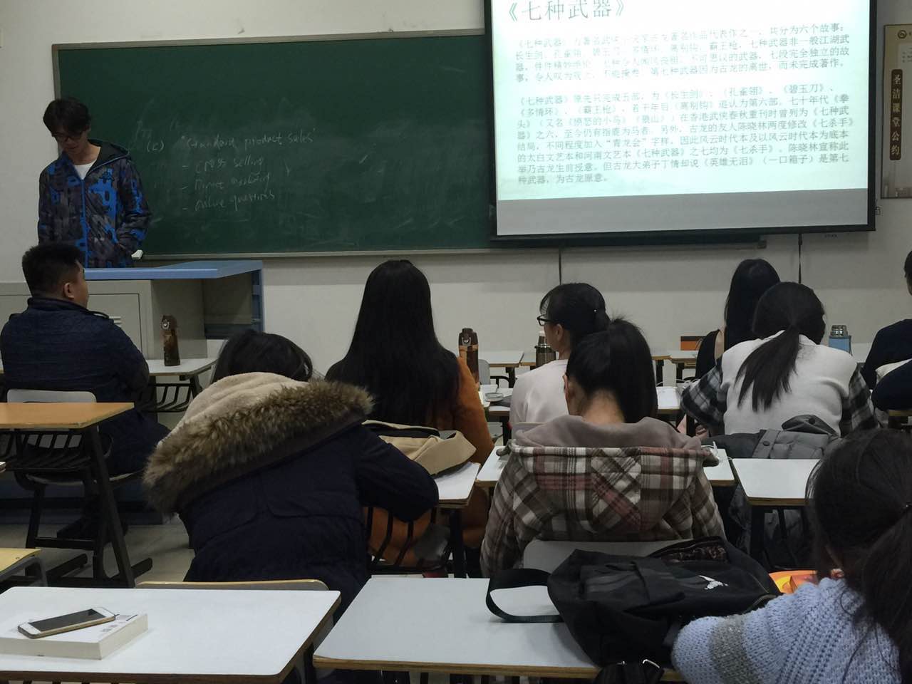 在座的同学们都深深感受到了《子夜》的魅力,提升起了对阅读的无限兴趣。其他班的讲解中不乏分享《了不起的盖茨比》、《苏菲的世界》、《红与黑》、《少年维特之烦恼》、《阿甘正传》以及《七种武器》等这样文学性小说作品的,也有更欣赏《精神明亮的人》一类散文随笔的,也不乏解析《乔布斯传》等名人传记的,更少不了分享《道德情操论》、《全球通史》、《时间简史》、《第三帝国的兴亡》等研究性学术作品的,还有同学则更乐于分享一些如《拖延心理学》、《遇见未知的自己》的更具有实用性、更现代的书籍。“少年维特之烦恼,也许我们都曾有,或许我们都将有。深深地爱着一个永远不可能得到的人而不能自已,这实在是人世间莫大的悲哀,值得我们去同情。”公共管理4班,正在分享《少年维特之烦恼》的文思齐同学如是说。