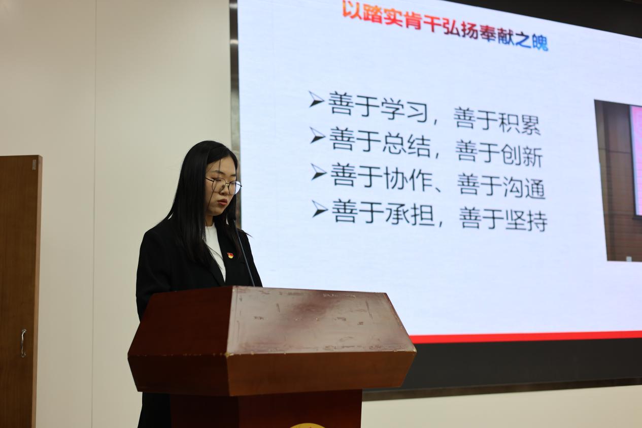 杨灵涵分享了作为一名研究生,个人学习科研的成长经历。她鼓励同学们要主动投入学习,夯实学习基础,拓展学习思路,掌握先进方法,敢于迎难而上持之以恒;要在生动火热的实习实践中感受祖国发展的巨大成绩,感悟青年学子肩负的时代使命,勇于投身基层一线,成为新时代国家发展建设繁荣富强的主力军和生力军。