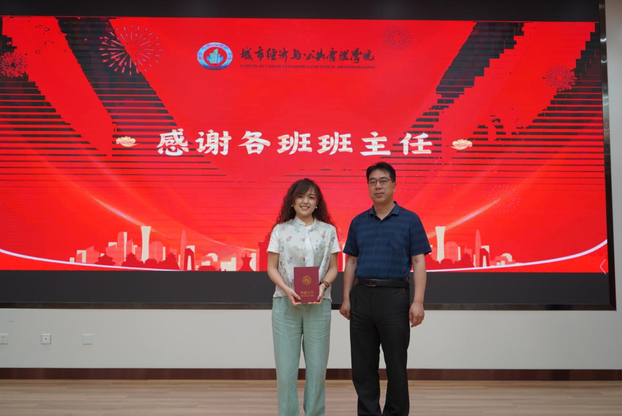 学生成长离不开班主任老师的悉心帮助与指导,为进一步鼓励支持班主任更好发挥作用,做好学生们的引路人,学院对全体班主任在过去一年中的工作进行了集中表彰,副院长刘智勇为年度优秀班主任代表行政管理系教师刘嘉颁发纪念奖。