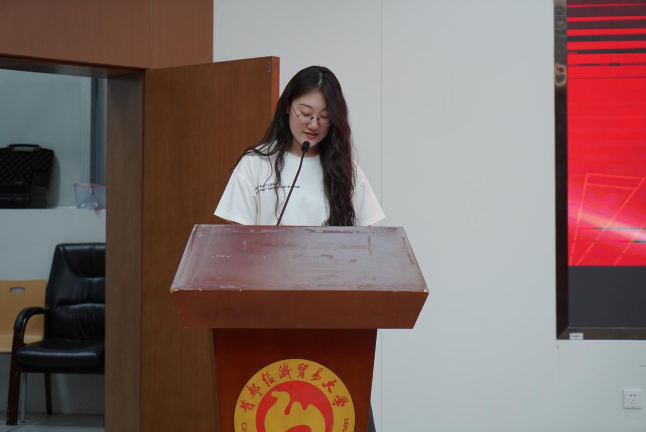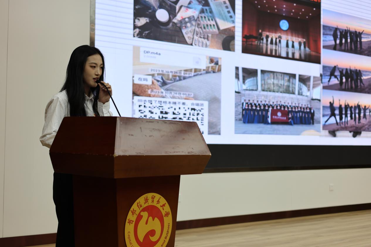 蔡子墨同学以“音为梦响,声随心动;有一分热,发一份光”为主题分享了自己感受“热”,获得“热”,成为“光”,传递“光”的成长经历。作为学校阿卡贝拉合唱团团长,她带领志同道合的同学们坚持不懈,将首经贸的声音唱给更多人听,音乐滋养的大学流淌着对学习的精益求精、竭尽全力和迎难而上,在志愿服务的大舞台上唱响青春之歌,歌声飞扬激昂青年新作为。