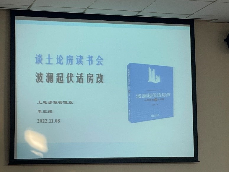 2022年11月8日,土地资源管理系在博纳楼第二会议室开展了“谈土论房”读书交流分享活动。本次活动由土地资源管理系主任徐虹老师主持,由李玉瑶老师分享《波澜起伏话房改》一书,系里部分青年教师及在读研究生共同参与。